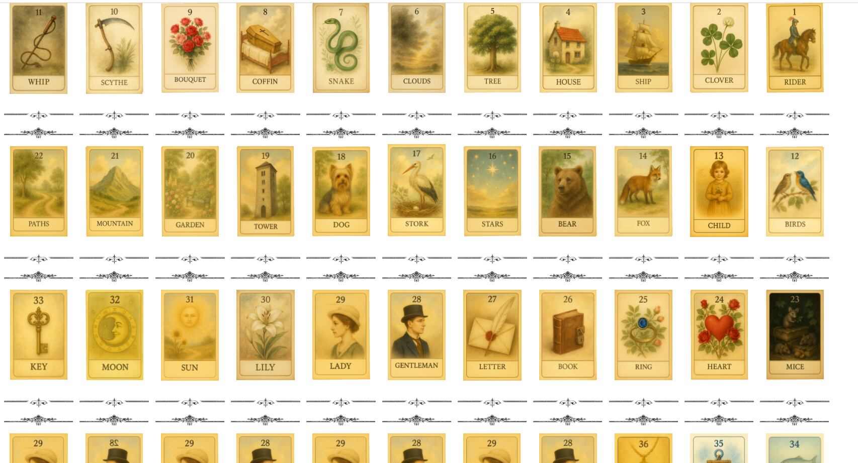 1:騎士、2:クローバー、3:船、4:家、5:樹木、6:雲、7:蛇、8:棺、9:花束、10:鎌、11:鞭、12:鳥、13:子ども、14:狐、15:熊、16:星、17:コウノトリ、18:犬、19:塔、20:庭園、21:山、22:道、23:ネズミ、24:ハート、25:指輪、26:本、27:手紙、28:紳士、29:淑女、30:百合、31:太陽、32:月、33:鍵、34:魚、35:錨、36:クロス